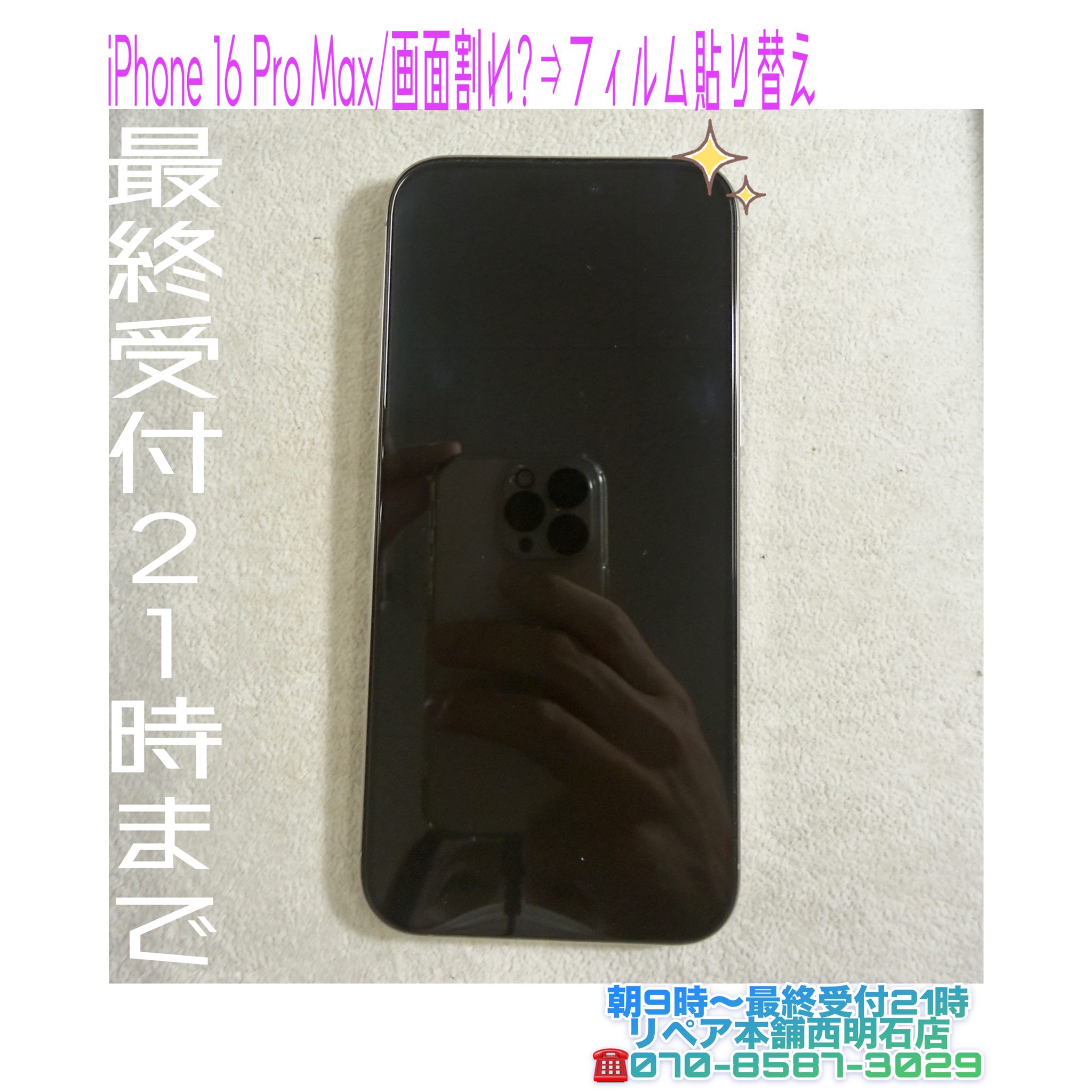💡20時前に西明石市の方より、iPhone 16 Pro Max画面割れ修理にてご来店です。フィルムのみ破損してた為貼り替えし無事完了です🛠️