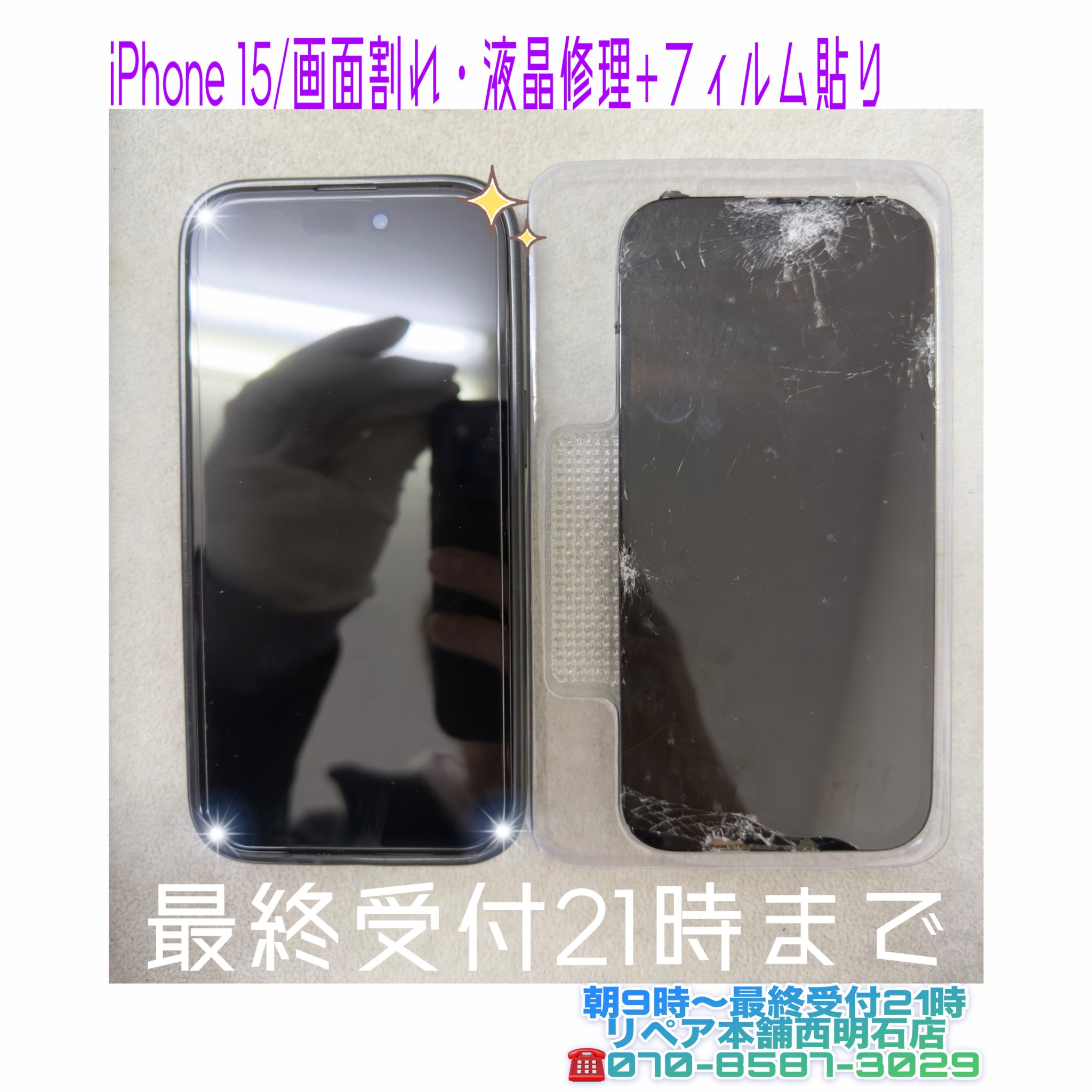 💡明石市の方より、iPhone 15をぶつけて画面が割れて液晶修理とフィルム貼りにてご来店です🛠️